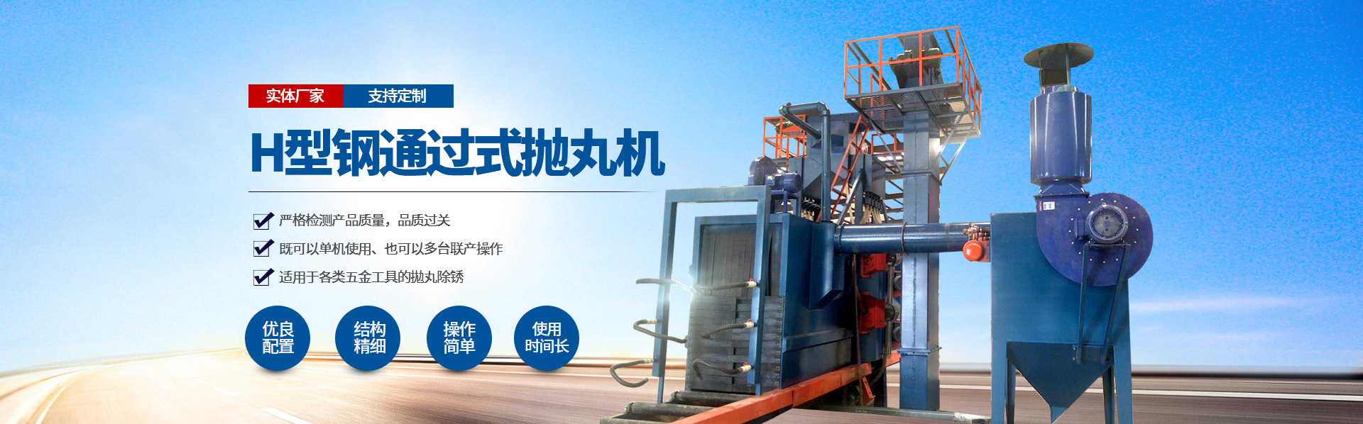 我公司集科研、設計、制造、安裝調試、售后服務于一體,技術力量雄厚,生產設備優良,機械銷往全國各地,享有良好的信譽。主要產品 有:Q32系列履帶式拋丸機、Q37系列吊鉤式拋丸機、Q69系列大型鋼板預處理生產線、QG系列鋼管拋丸清理機、Q38/Q48/Q58懸鏈式拋丸機等系列拋丸清理機;及各種型號的合金鑄件,耐磨配套件等。本公司亦可根據客戶要求進行非標準設備制造。